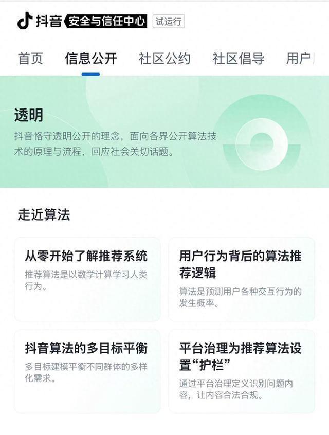 近日,“抖音安全与信任中心”网站上线。网站面向社会公开抖音算法原理、社区规范、治理体系和用户服务机制。
